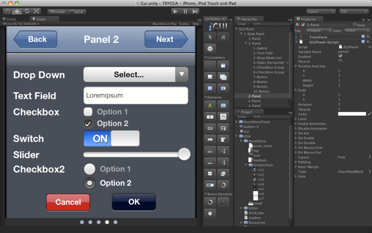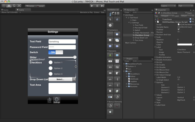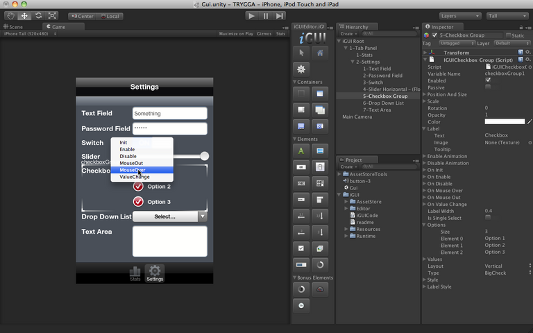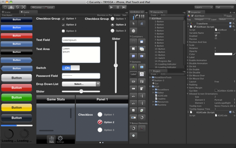 iGUIiGUI является простым в использовании и полным в соответствии рамкам GUI в Unity3D. Просто выберите элемент из панели инструментов и нарисуйте его непосредственно на вашей игре. Вы можете дважды щелкнуть на элемент, который вы хотите использовать, чтобы перейти к блоку основного кода событий. Так же, как Visual Studio. Поддерживает как JS и C#. Требуется Unity3D 3.5.7 или выше. Совместимо с обеими Unity3D 3 и Unity3D 4! Внимание: Пожалуйста, сделайте резервную копию всей вашей папке с проектом перед установкой новой версии 1.4.x. Положение и размер элементов может быть абсолютным или относительным. Можете переключиться на режим отображения "сетчатки" с щелчком мыши. Web сайт: Для получения дополнительной информации посетите сайт разработчика. ![]() ![]() Скачать iGUI и 2 видео урока по использовании: Прикрепления: Картинка 1 | |